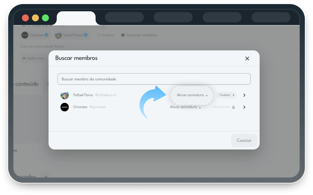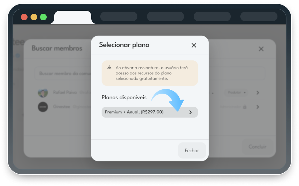 Ainda na tela inicial, pressione "Gerenciar membros", e o usuário recém cadastrado estará na lista. Encontre o usuário e pressione em "Ativar assinatura". A lista de planos disponíveis irá aparecer na tela, selecione o plano desejado e confirme a ativação:
